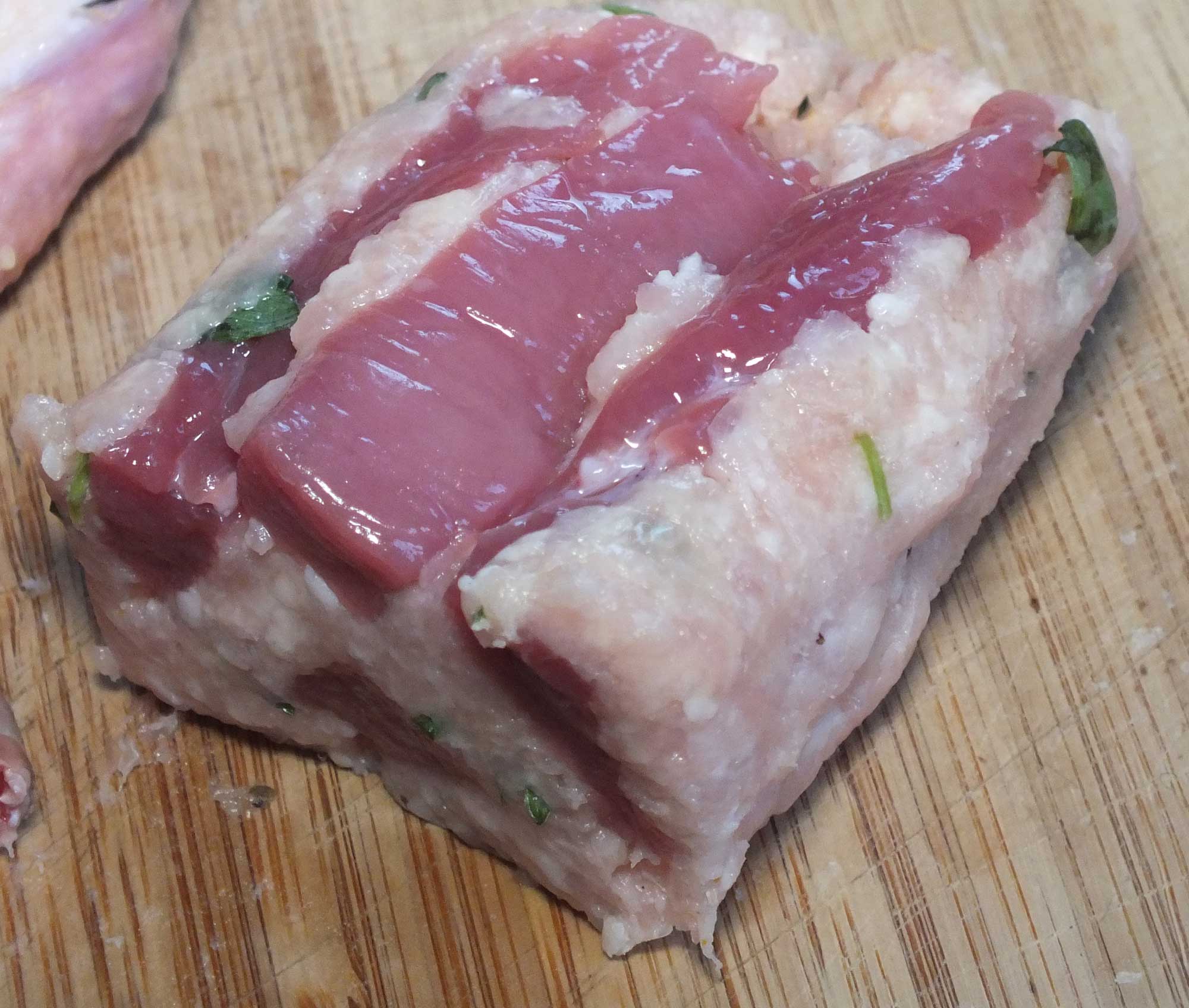 This is a close up of the cross section of strips of Duck Breast and very fine forcemeat that forms the centre of this bird. This runs right through the centre of the bird from front to back.