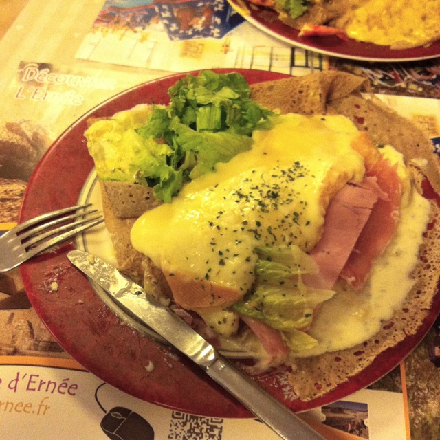 French comfort food in a cheap cheerful cafe in the little village of Ernee. Galette is the snack food of Btittany. It’s a buckwheat pancake with fillings. This one stuffed with potatoes, onions, garlic and two types of ham all finished off with a light sauté in cream. Then a huge slab of raclette (a melty mountain cheese) is melted on top. Perfect with a carafe of chateau plonk of the red variety. Cost with wine 8 quid.