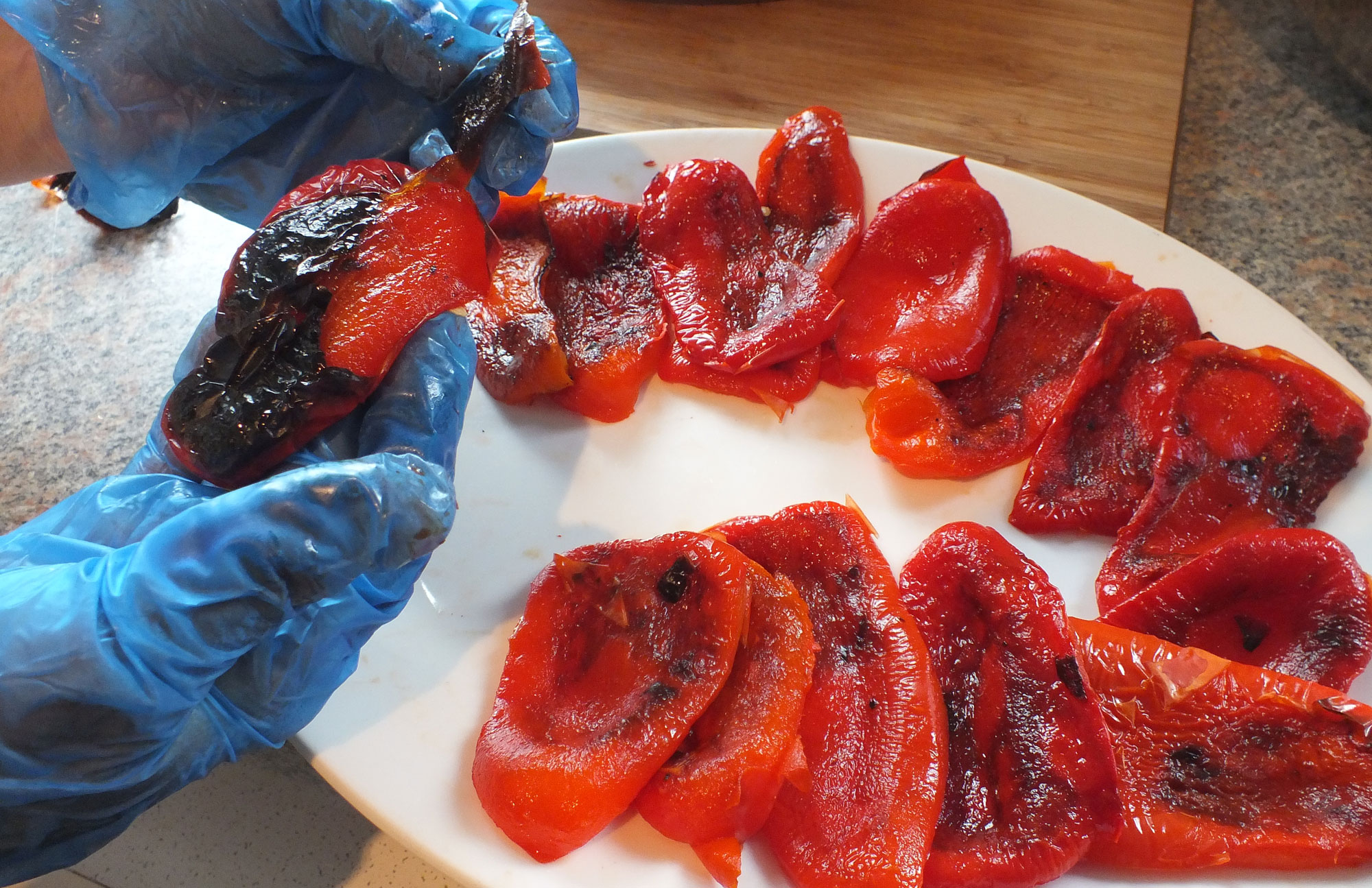 The blackened skins being peeling off the peppers