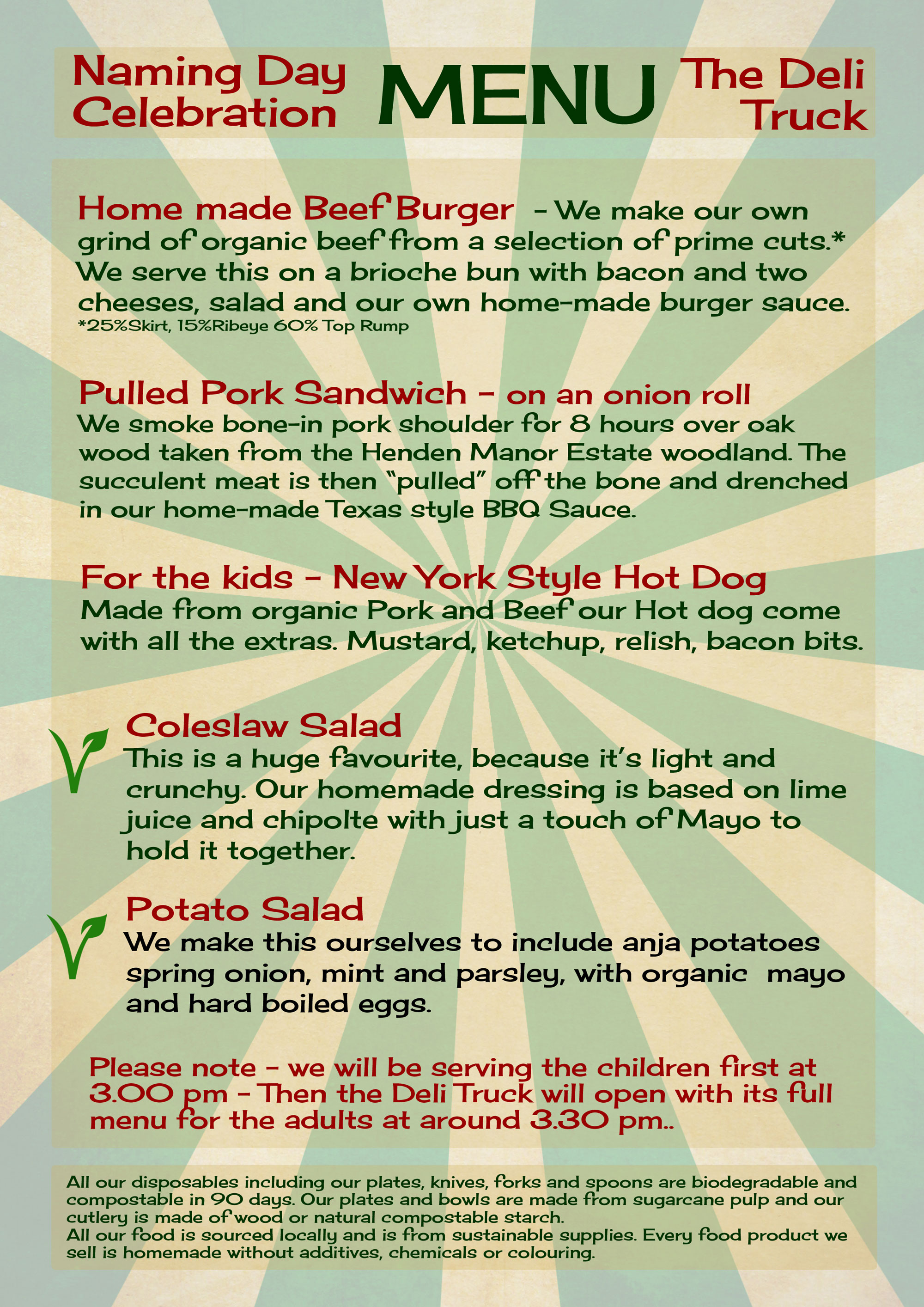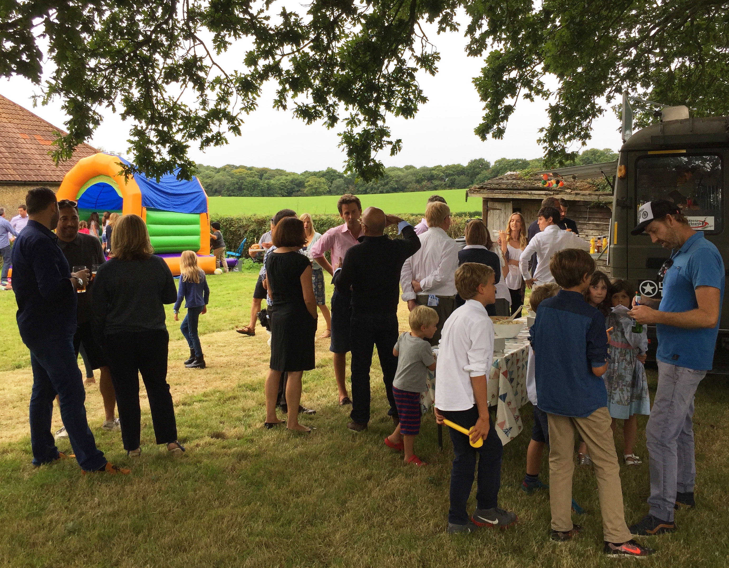 A very special day for a young couple as they held a very relaxed naming day for their three children. Guests were mostly from London where the hosts used to live before moving to a very romantic farmhouse in the middle of the Kent Weald. The crowd were cricket mad and a pitch had been set up beside the deli truck for an after eating game. We had to duck a few times during the game.