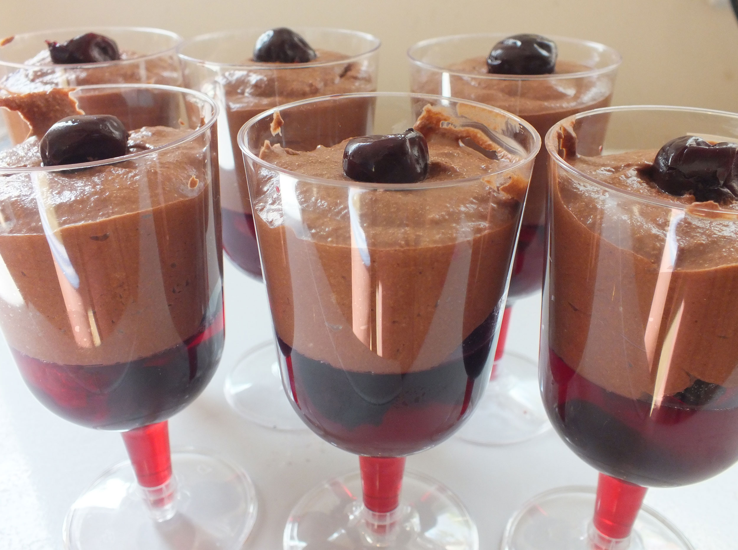 We have just finished making 60 “individual chocolate mousses on top of fresh raspberry, morello cherries, and cherry brandy jelly” The jelly base was made from the juices from the morello cherries and about half a bottle of Cherry brandy – in that mixture we have added fresh raspberries and morello cherries – so a very fruity and adult flavoured jelly base – with home made chocolate mousse on top. Takes 3 blocks of chocolate for very 12 servings of Mousse.