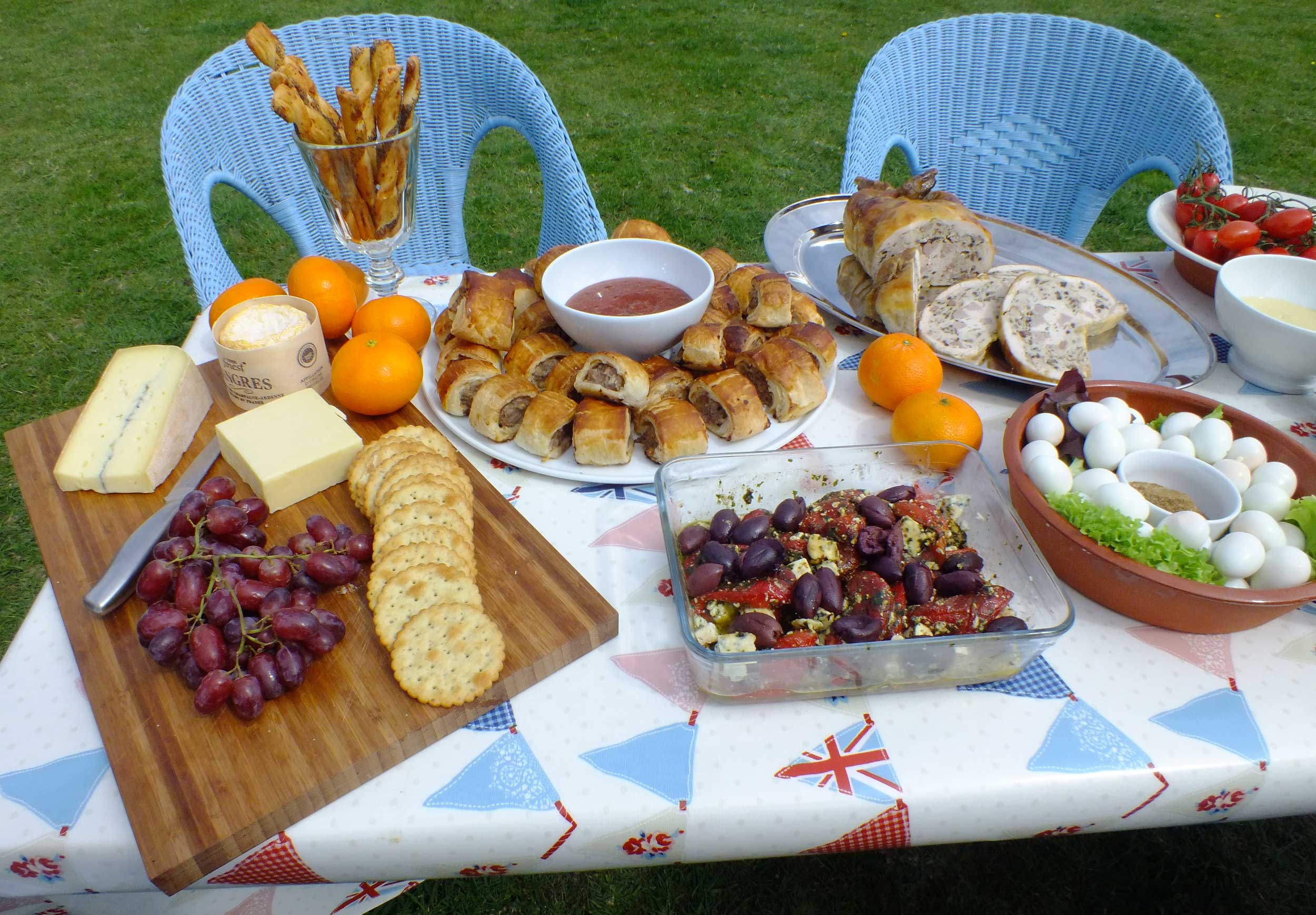 A tasty picnic of light bites. From Left to right – A cheese board with grapes, home made sausage rolls, a salad of roasted red peppers, olives, feta and pesto – a galantine of guinea fowl, quail eggs with celery salt fresh heritage tomatoes, potato salad. Dessert (not on the table) fudgy chocolate brownies, fresh strawberries and cream