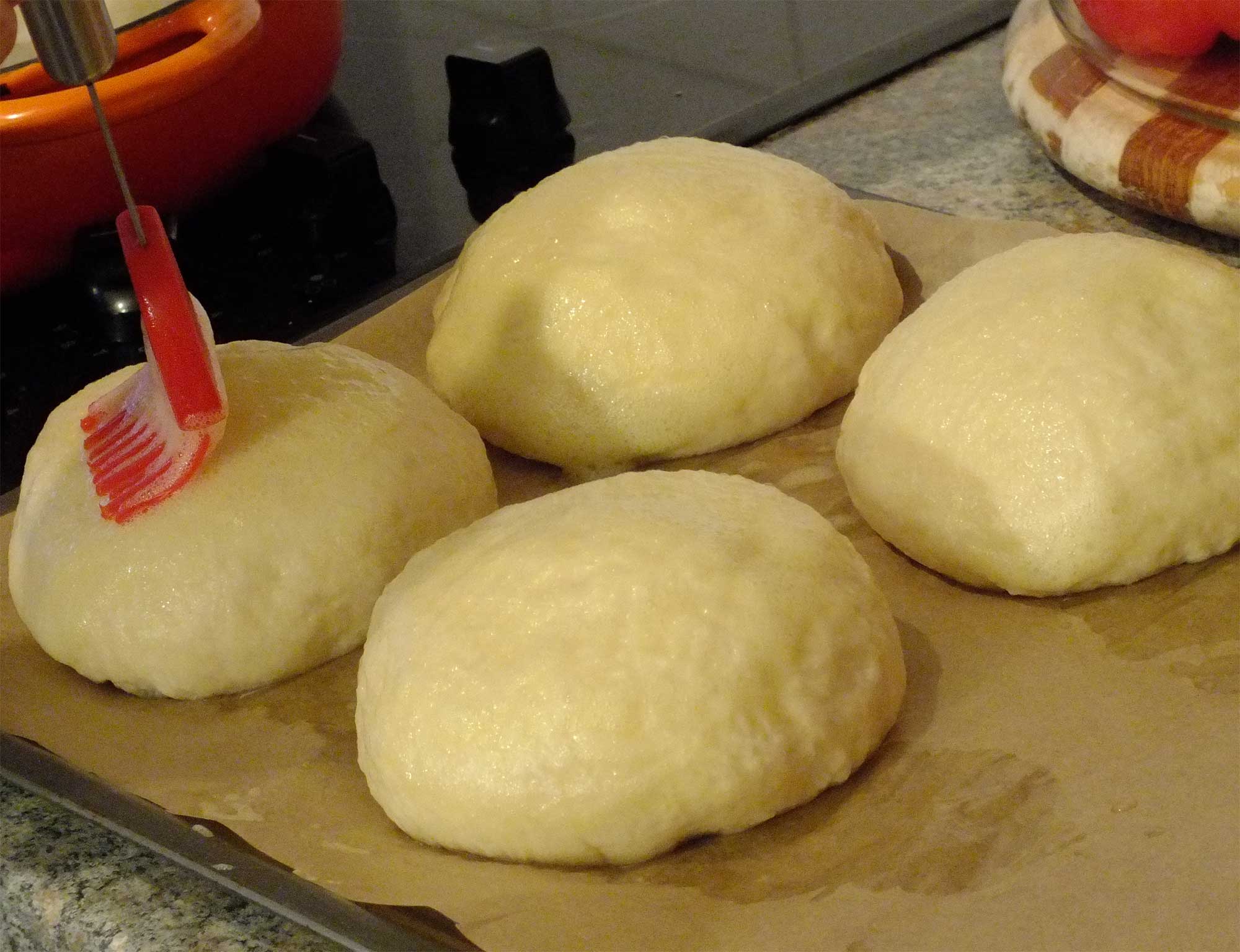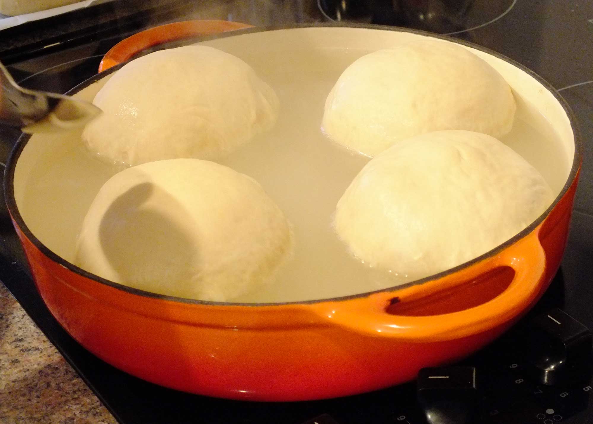 uncooked bun dough then goes into a pan of simmering water for 30 seconds on each side.