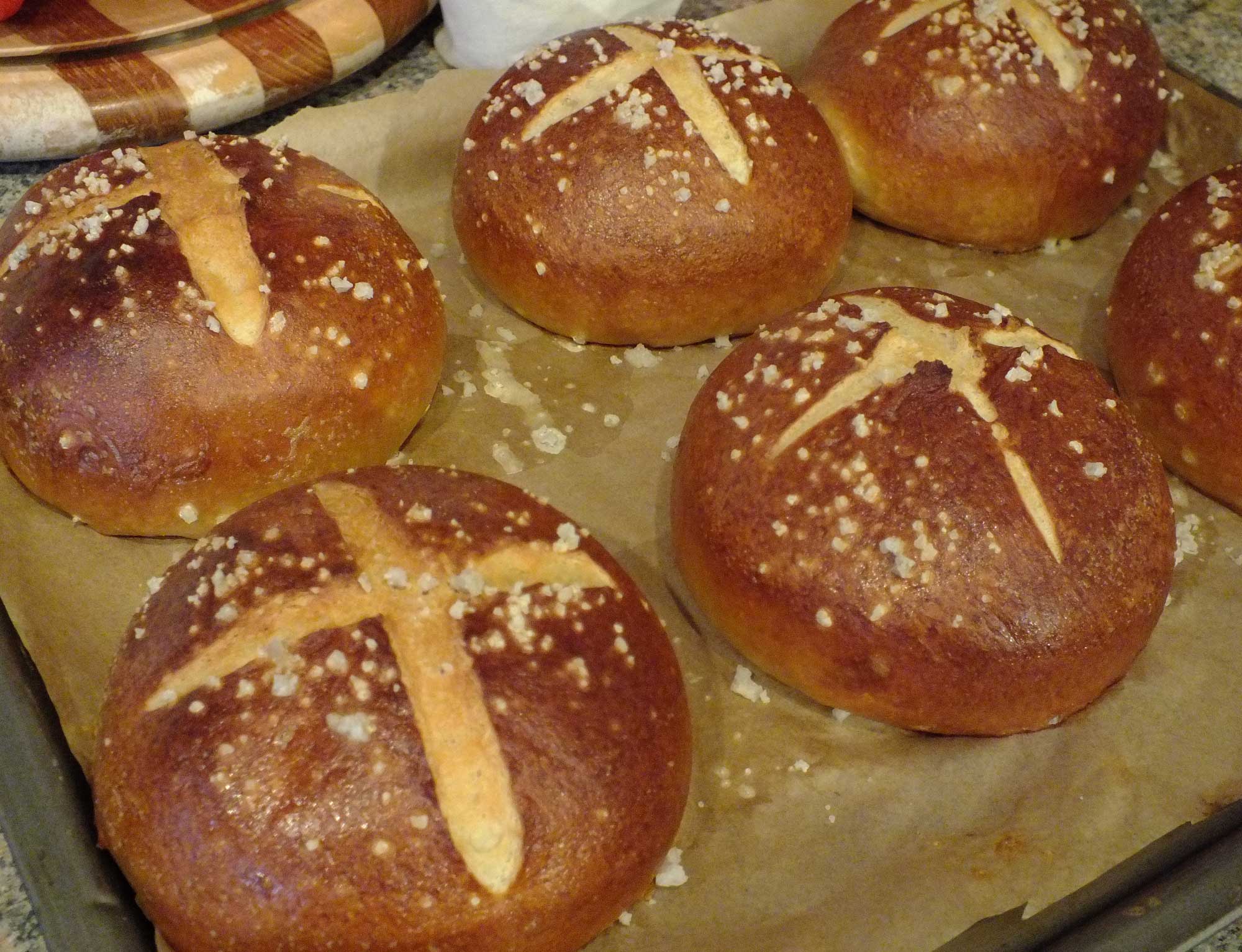 We think this is the best burger bun in the world – why? because we make it ourselves. We spent months trying to find the perfect burger bun, but keep being disappointed. Believe it or not there is quite a lot of science involved in getting just the right bun. Firstly it has to be tough enough to handle a super heated 8 oz piece of pure beef, it has to soak up meat, cheese and bacon juices with out disintegrating and it has to have a warm doughy interior for taste and “mouth feel” We finally decided, after talking to friends in the US, that we would try a burger bun made out of “soft pretzel dough” This is a wonderful dough – but to make it into a bun takes a lot of work because just like a bagel, this bun is simmered in water for 60 seconds before it’s popped in the oven for a further 20 minutes. The genius behind this way of cooking is that the outside of the bun becomes firm, but pliable – in other words it doesn’t break up and the inside is still delightfully bready and rich and soft. So finally we have found our perfect burger bun and we hope you enjoy it next time you come and see us.  The next set of pictures show how we made our first small test batch.