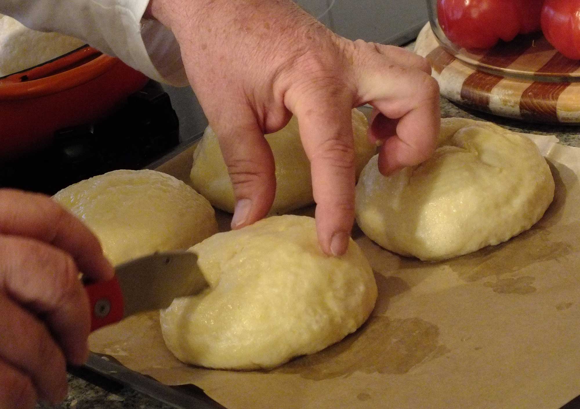 The rolls are then sliced into a cross cut, because the outside of the roll is now cooked and has killed the yeast, but the inside is still raw and needs to expand rapidly once it gets in the oven – these slits allow the expansion without the roll exploding .